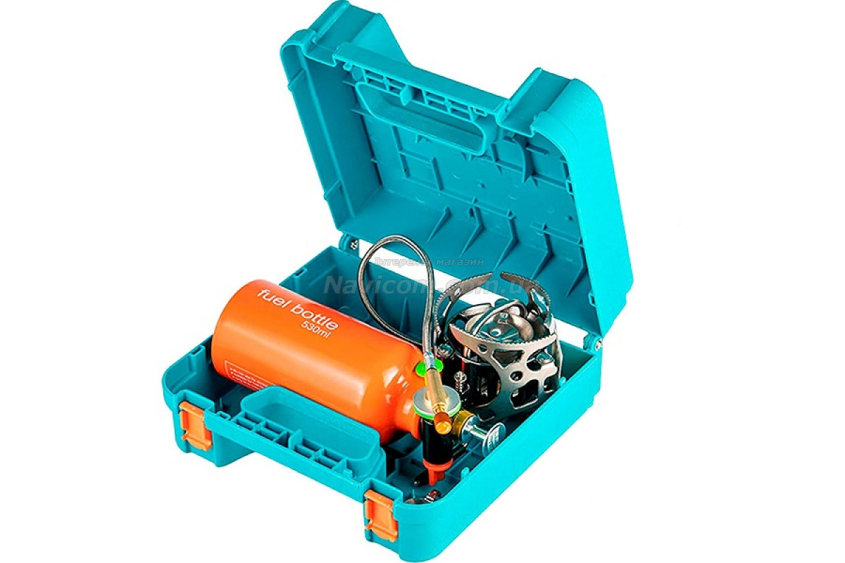 До комплекту з пальником також входить алюмінієвий насос, силумінова помпа, паливний балон на 450 мілілітрів, шланг довжиною близько 270 міліметрів. Всі предмети компактно складаються у фірмову валізу яскравого блакитного кольору, всередині якої для кожної деталі відведено своє місце. Це не тільки дозволяє зручно переносити набір, але також запобігає появі подряпин на металевій поверхні аксесуарів, що часто відбувається у разі тертя предметів один об одний при транспортуванні. Вага BRS-8A складає 501 грам.
