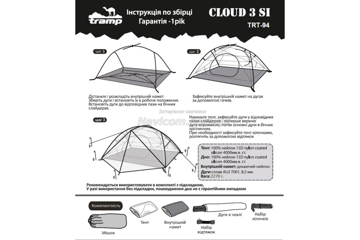 Намет пошитий з міцного, підсиленого Rip-Stop плетінням та просоченого силіконом, нейлона з високим рівнем водонепроникності.
