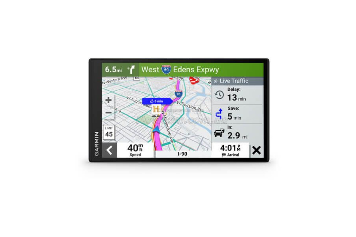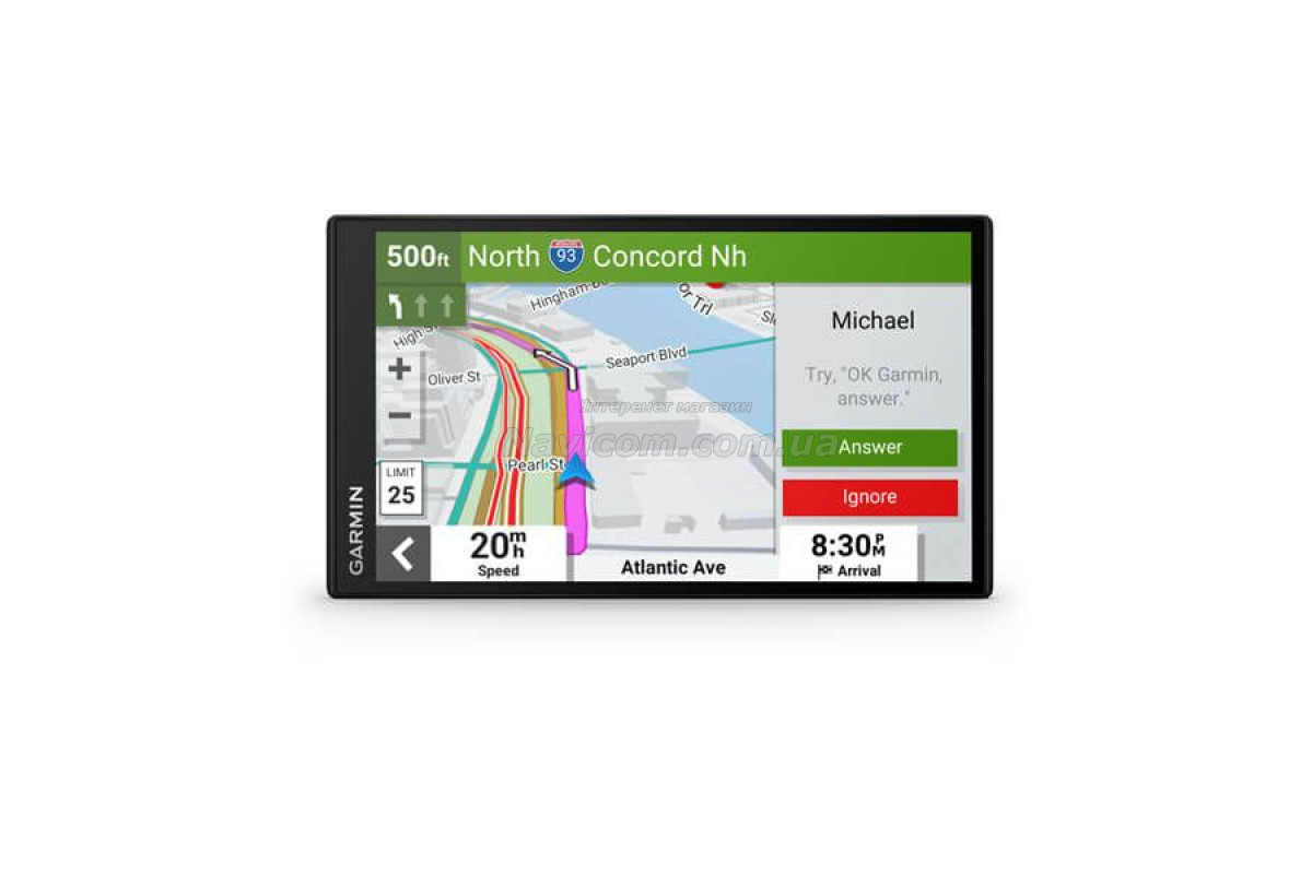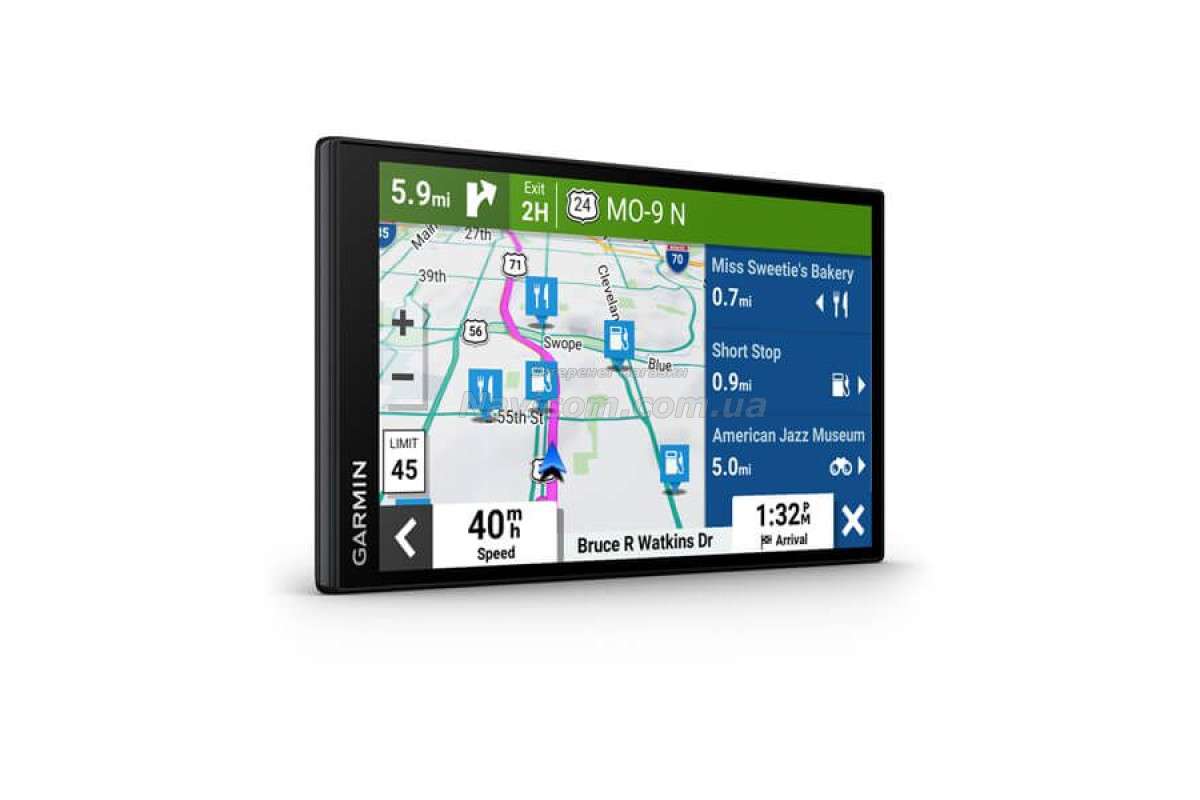 • Зручно переглядайте карти на яскравому, чіткому 7-дюймовому дисплеї з високою роздільною здатністю. • Поговоріть зі мною. Використовуйте голосову функцію Garmin, щоб отримувати навігаційні інструкції та розмовляти телефоном у режимі «вільні руки».