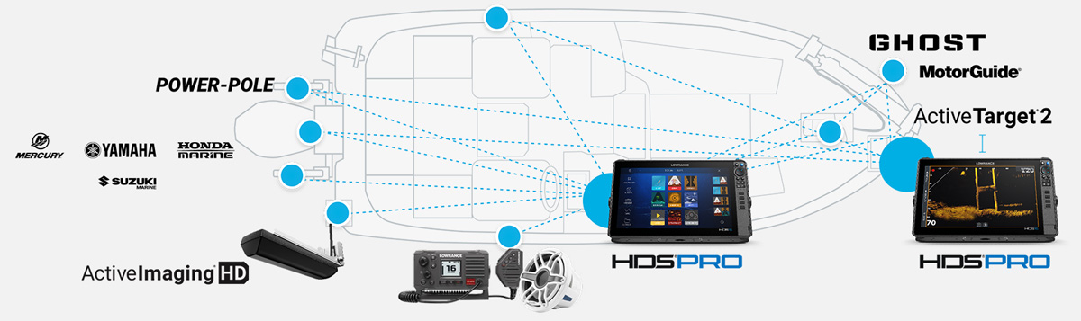 HDS® PRO предлагает полное сетевое соединение от носа к корме, а также расширенное управление системой Ultimate Fishing System.