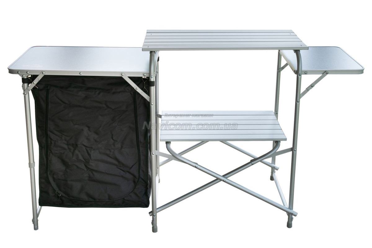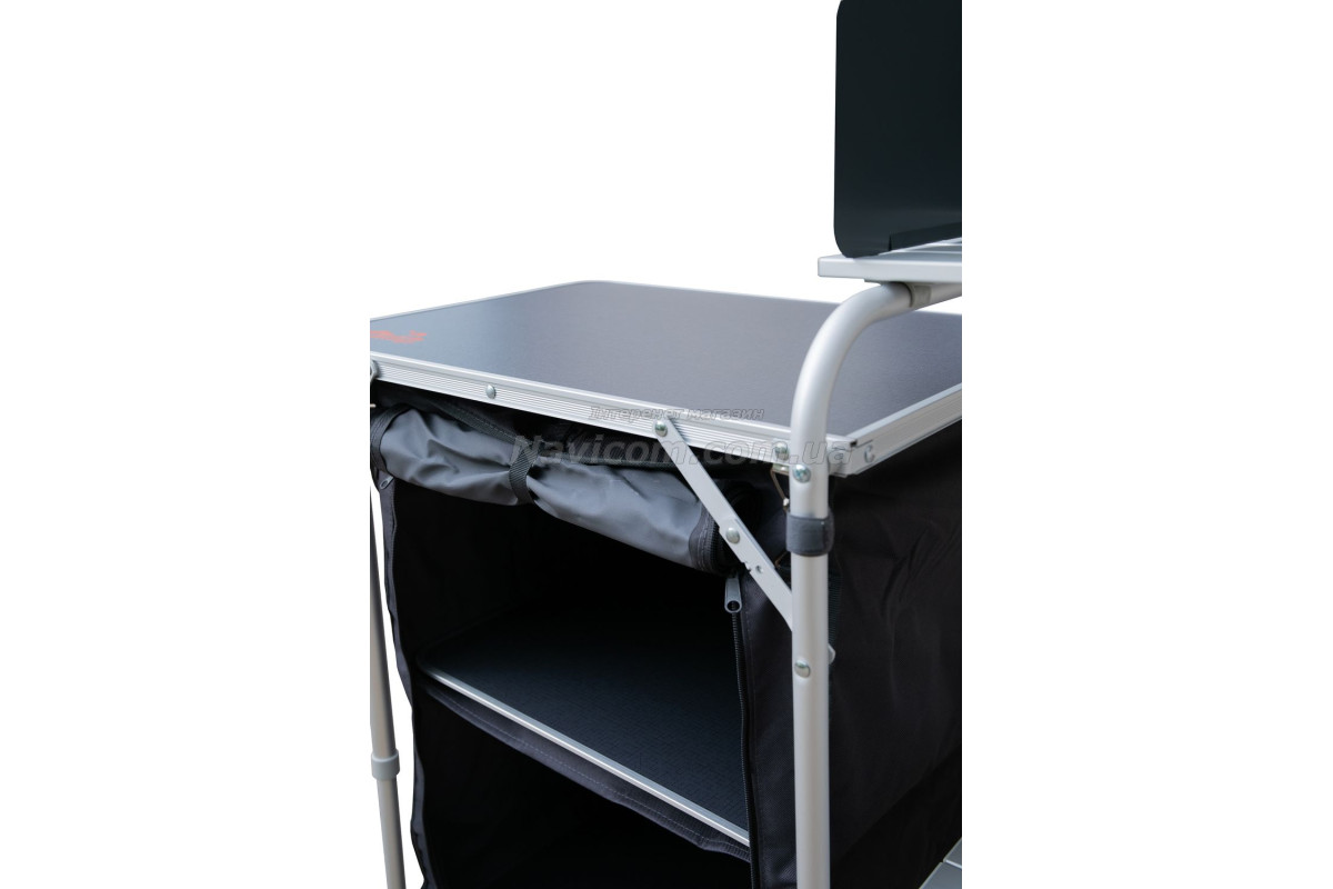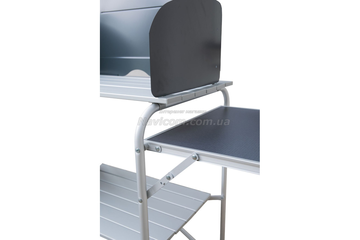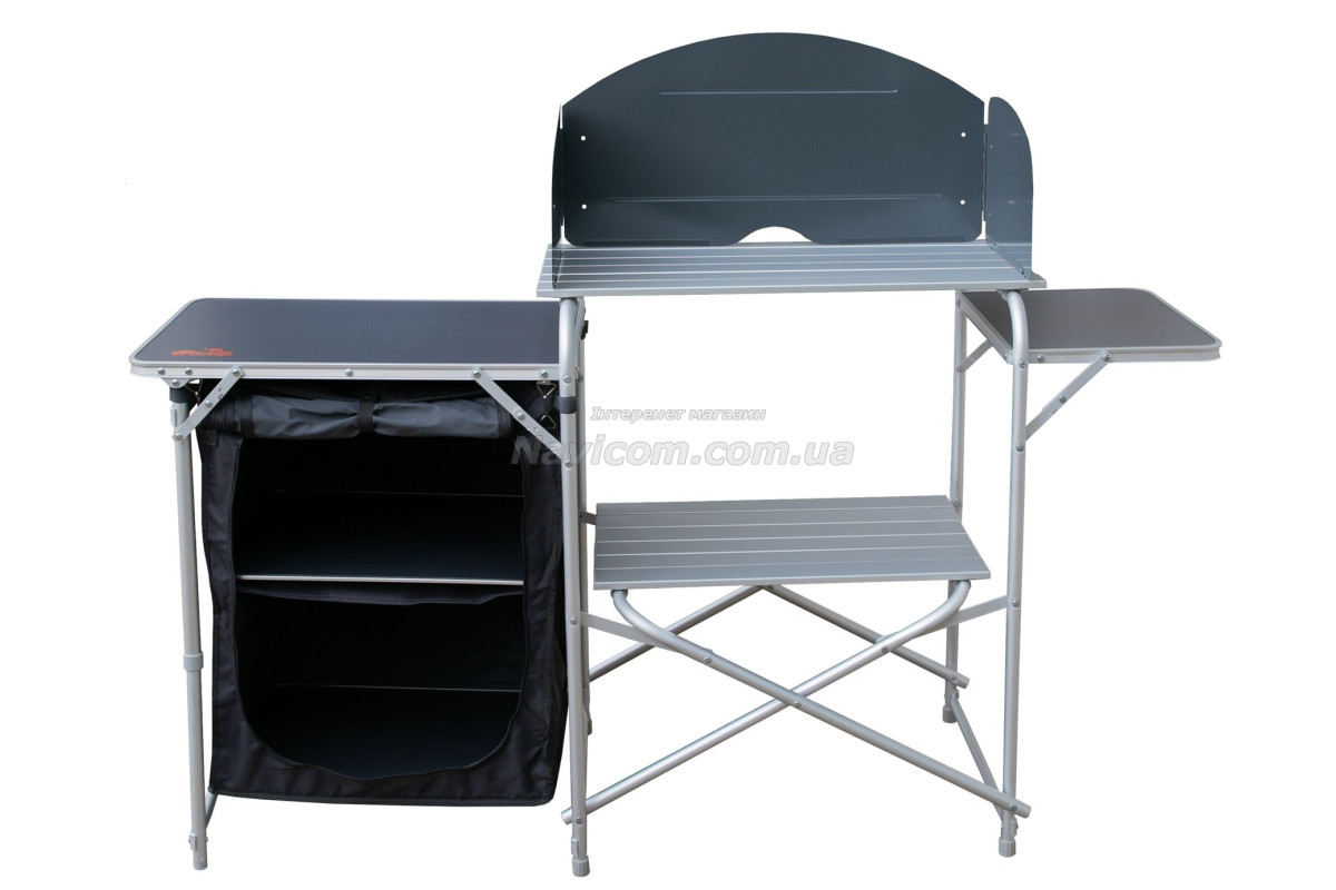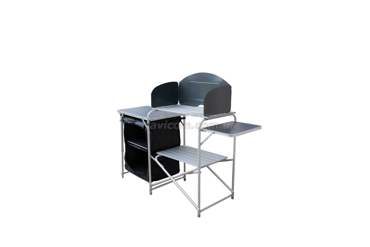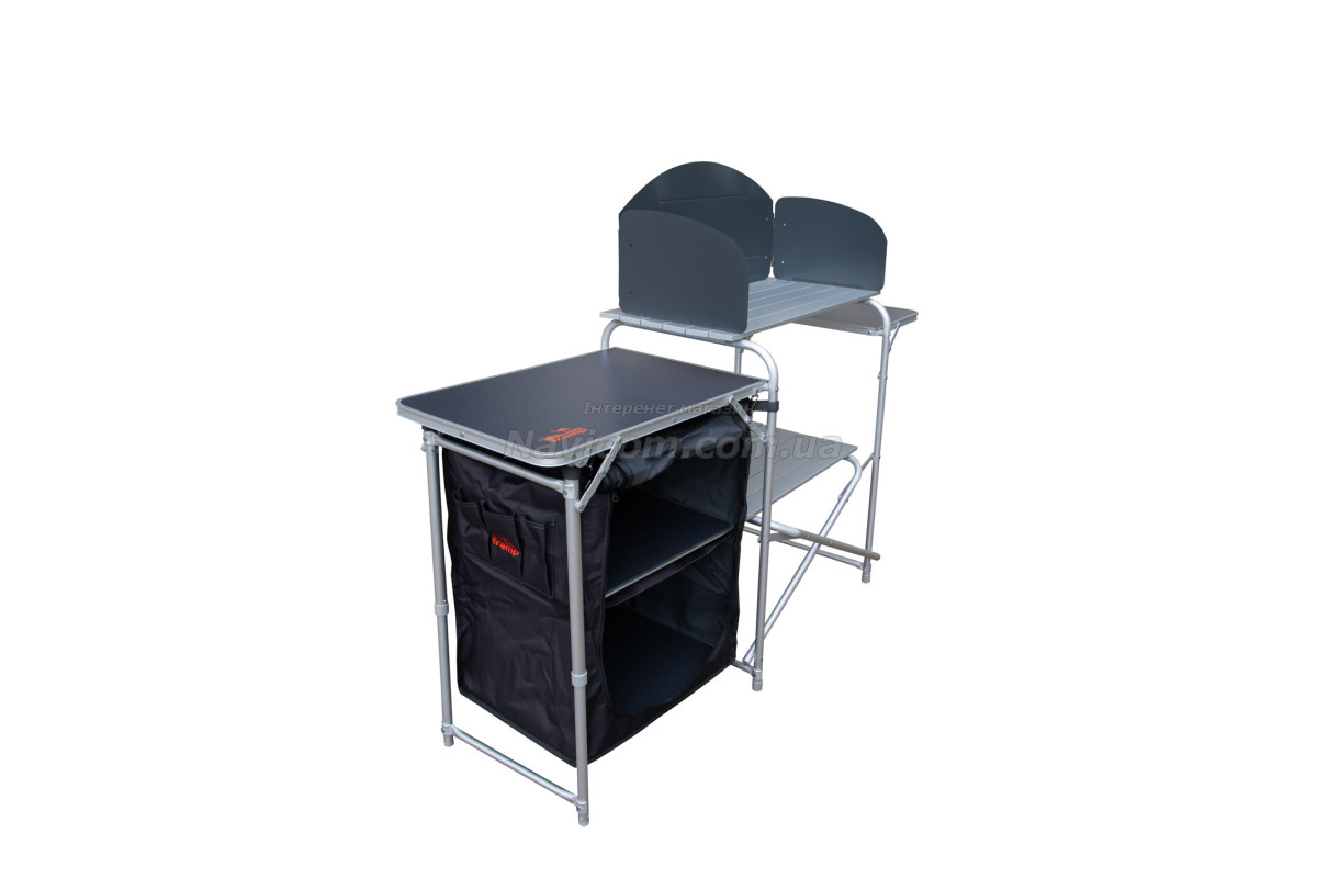 Складна кемпінгові шафа-кухня Tramp TRF-021 має зйомний складаний вітрозахисний екран на основний робочої поверхні, бічний допоміжний столик, 1 вбудовану полицю в центральній секції, зручну бічну шафку з 2 полицями для зберігання посуду і продуктів та додатковою верхньою робочою поверхнею.