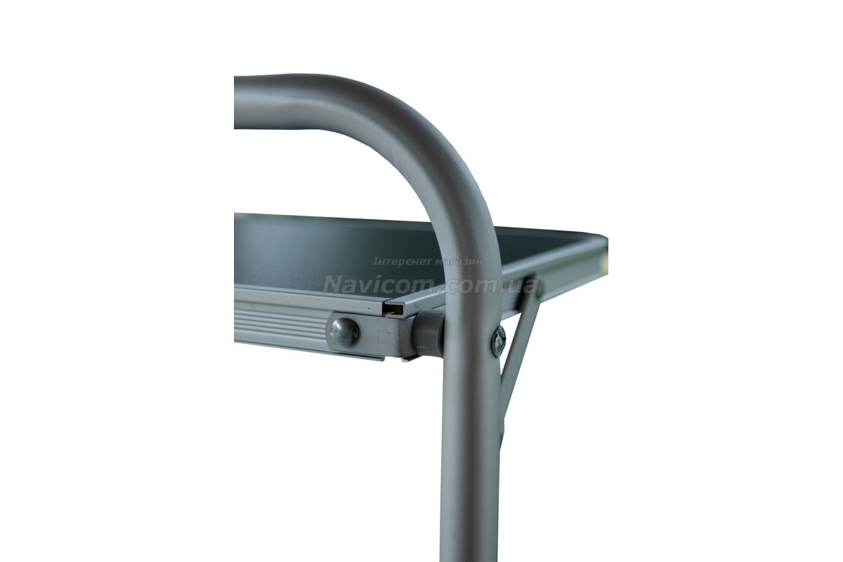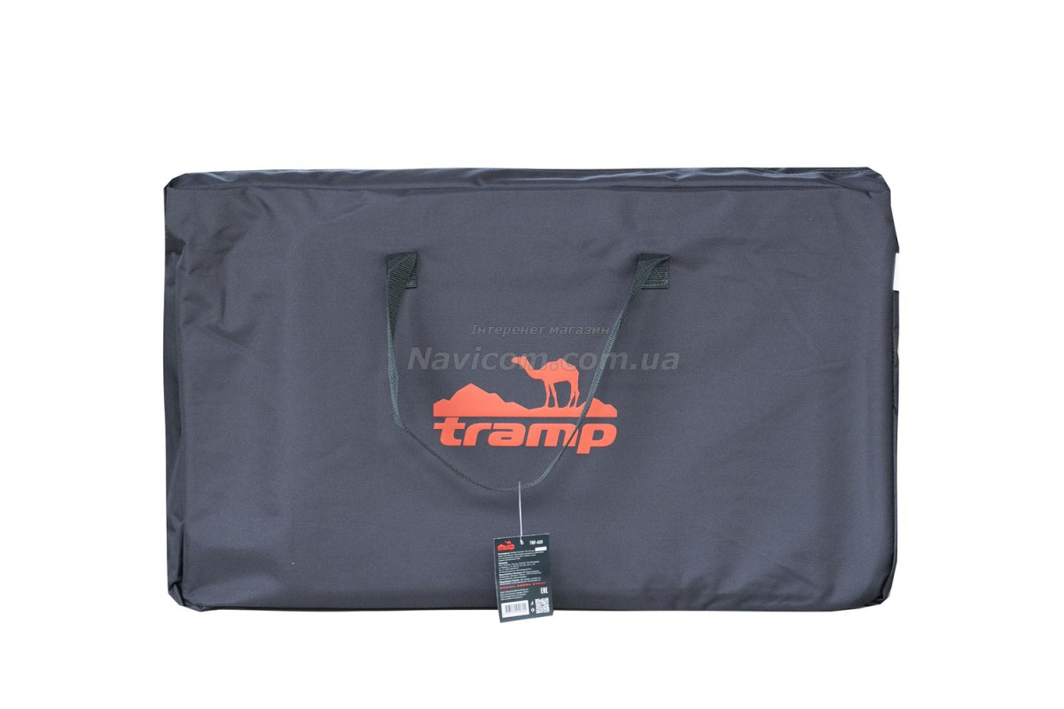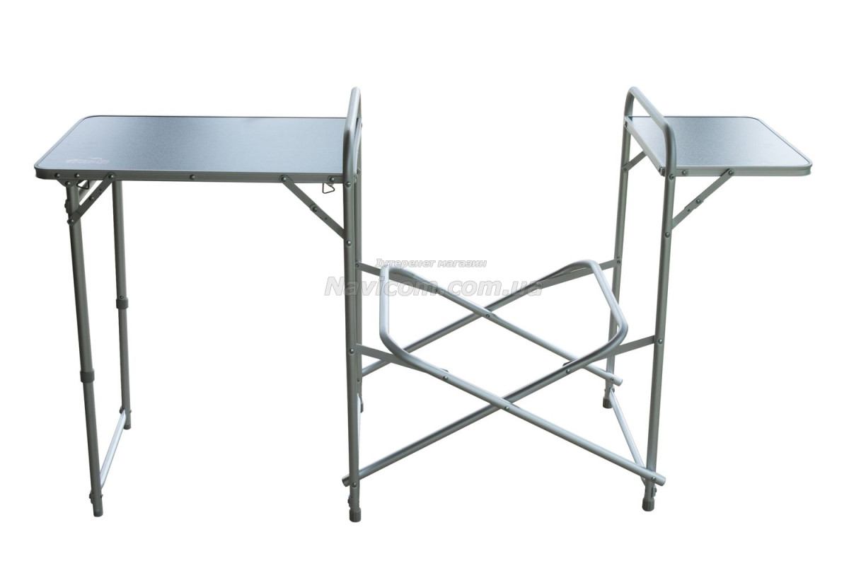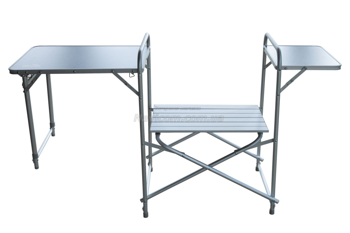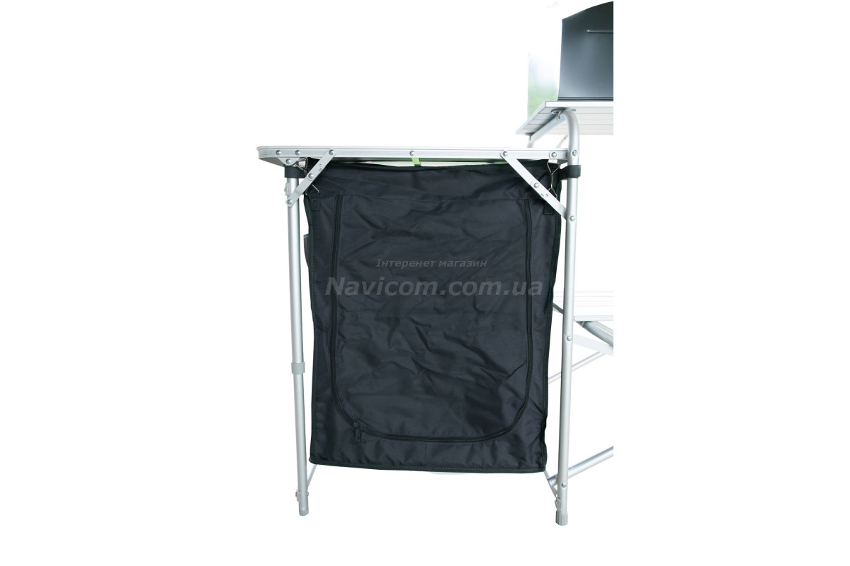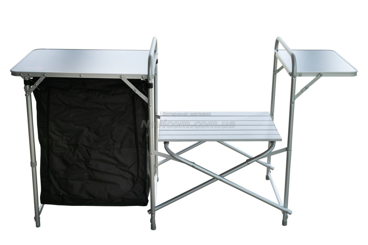 Складна кемпінгові шафа-кухня Tramp TRF-021 має зйомний складаний вітрозахисний екран на основний робочої поверхні, бічний допоміжний столик, 1 вбудовану полицю в центральній секції, зручну бічну шафку з 2 полицями для зберігання посуду і продуктів та додатковою верхньою робочою поверхнею.