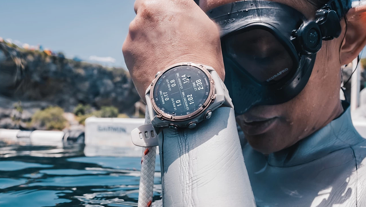 Цей годинник з яскравим кольоровим дисплеєм AMOLED діагоналлю 1,2 дюйми, сапфіровою лінзою, корпусом, що витримує статичний тиск до 20 АТМ, і герметичними металевими індуктивними кнопками створено для глибоководних занурень (до 200 м).