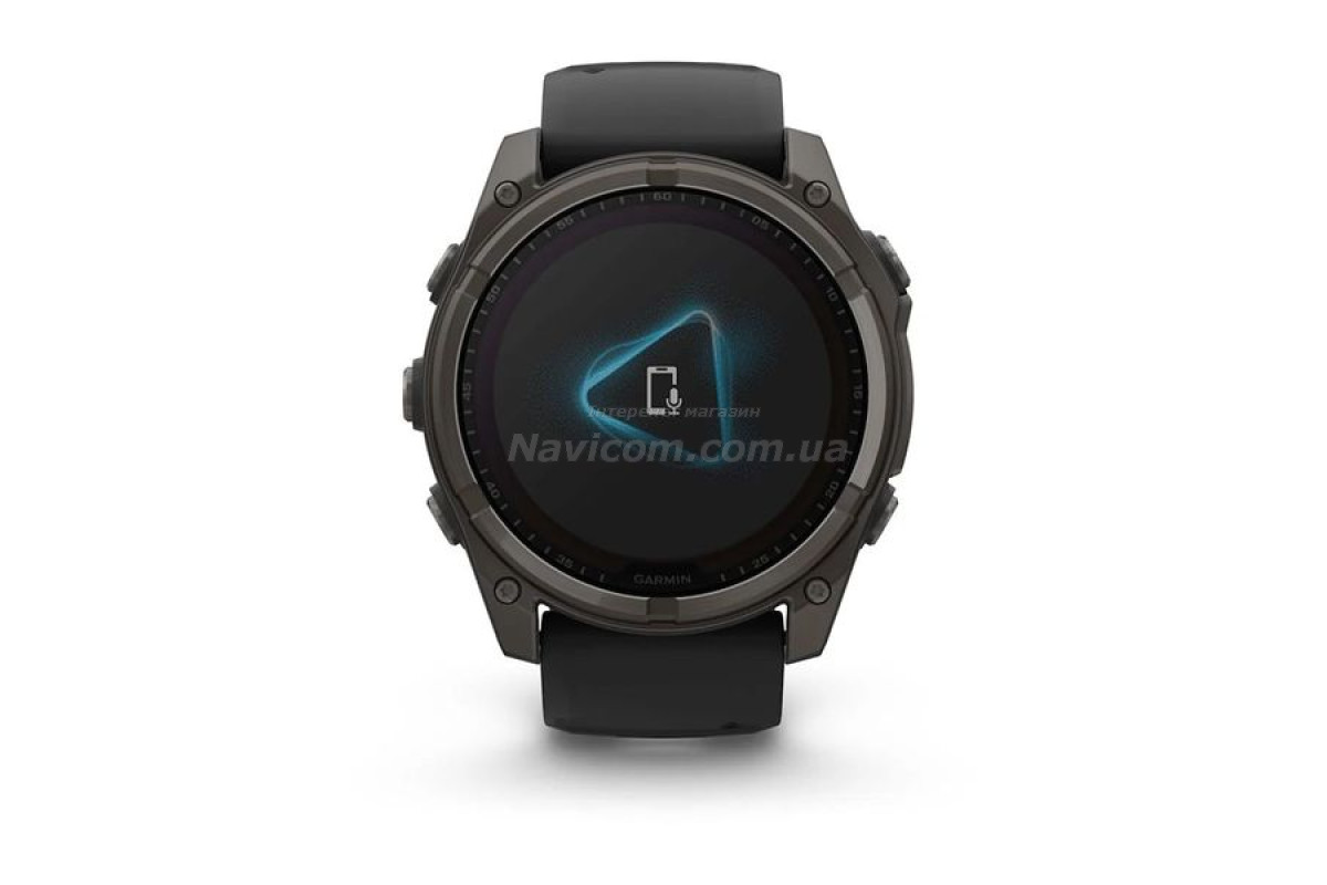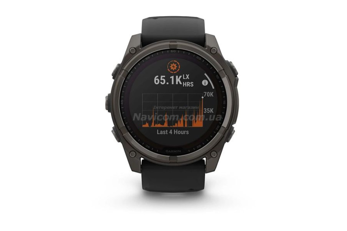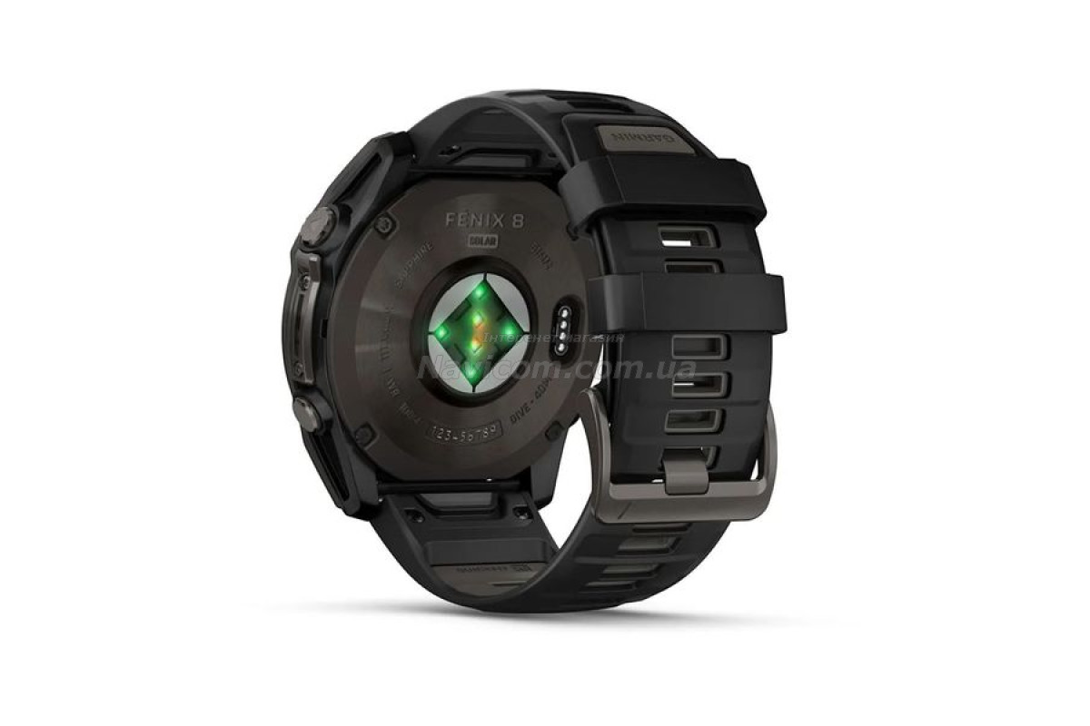 Смарт-годинник Garmin fenix 8 (51 мм) Sapphire Solar карбоново-сірий DLC титан чорний для серйозних спортсменів і шукачів пригод, які прагнуть вийти за межі своїх можливостей; цей спортивний GPS-годинник преміум-класу створений для великих зап'ясть та містить розширені функції для силових тренувань, можливість занурень під воду, вбудований динамік і мікрофон для голосових функцій, вбудований світлодіодний ліхтарик і до 48 днів роботи завдяки склу Power Sapphire, що забезпечує заряджання від сонячної енергії.
