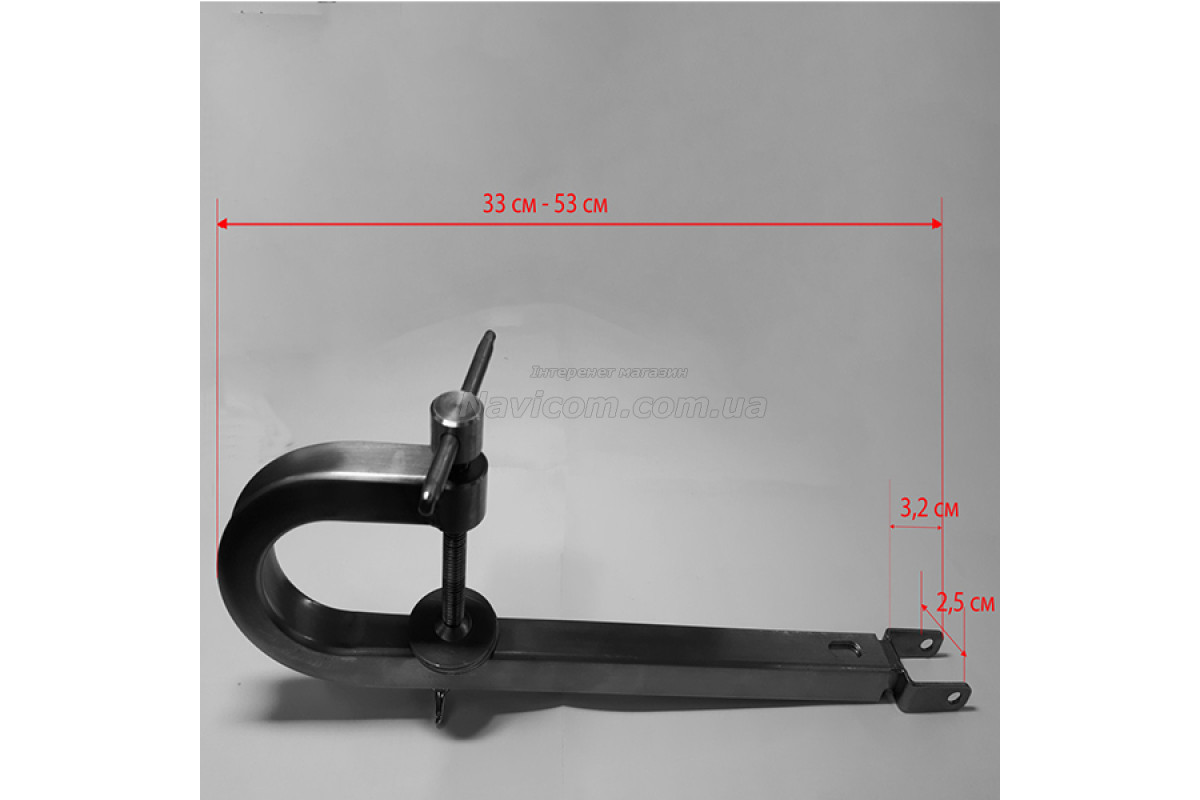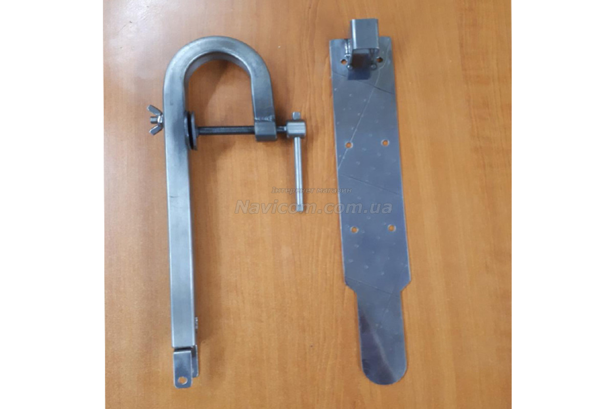 Струбцина кріпиться до транцю човна, виготовлена з якісної нержавіючої сталі, що надає жорсткості конструкції. Довжина струбцини регулюється від 35см до 53см.