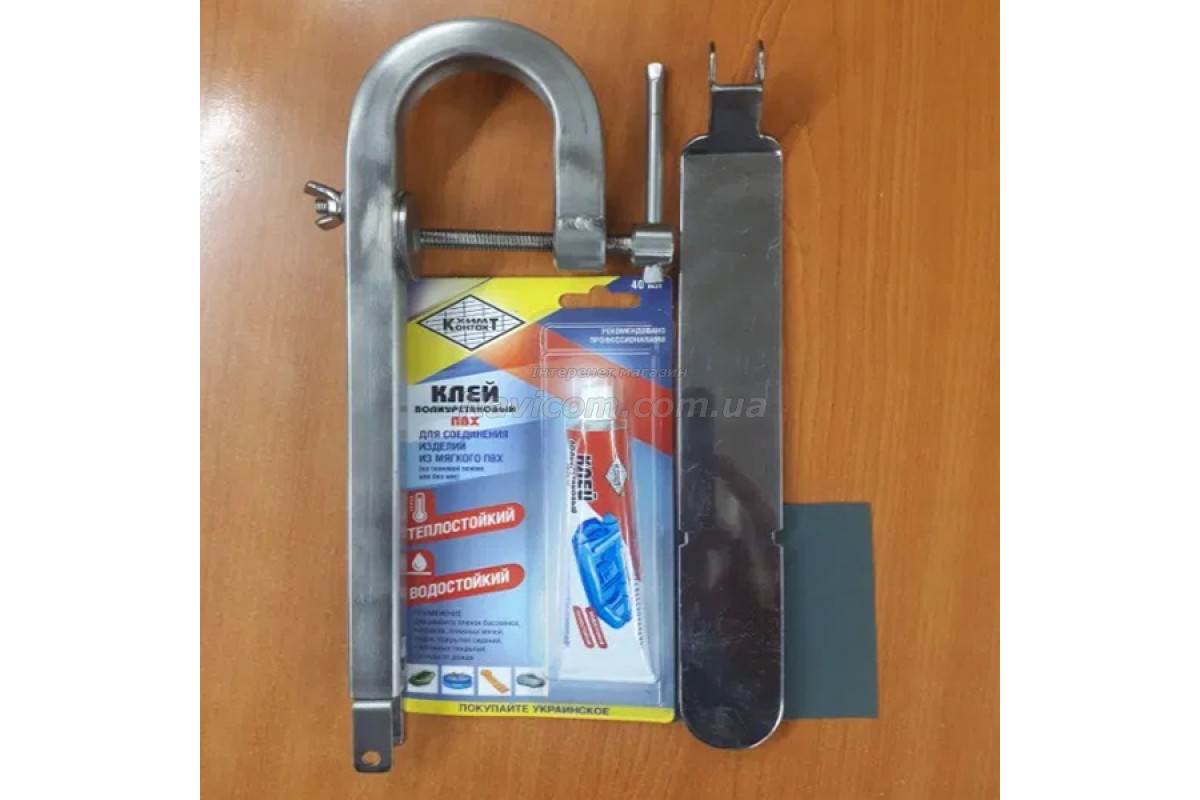 Струбцина кріпиться до транцю човна, виготовлена з якісної нержавіючої сталі, що надає жорсткості конструкції. Довжина струбцини регулюється від 35см до 53см.
