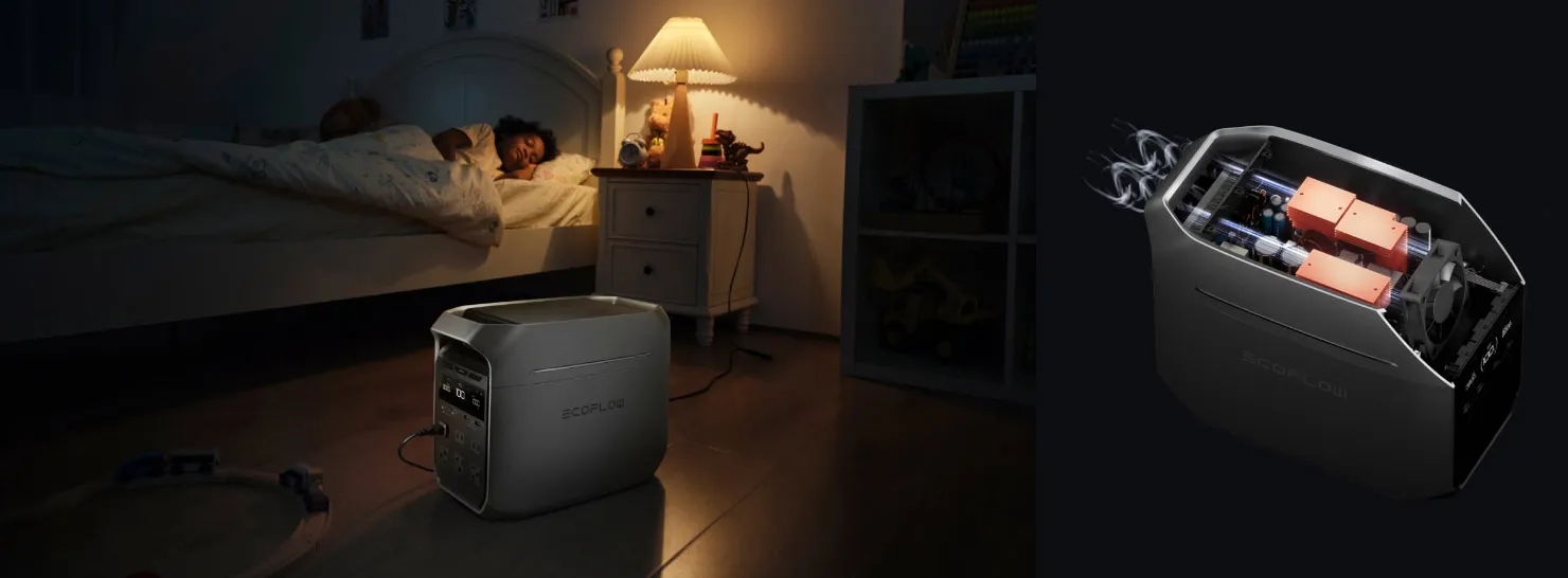 Однією з переваг EcoFlow Delta 3 є його низький рівень шуму. Під час роботи на потужності менше 600 Вт рівень шуму становить лише 30 дБ, що робить його практично безшумним. Це чудове рішення для нічного використання або в приміщенні.