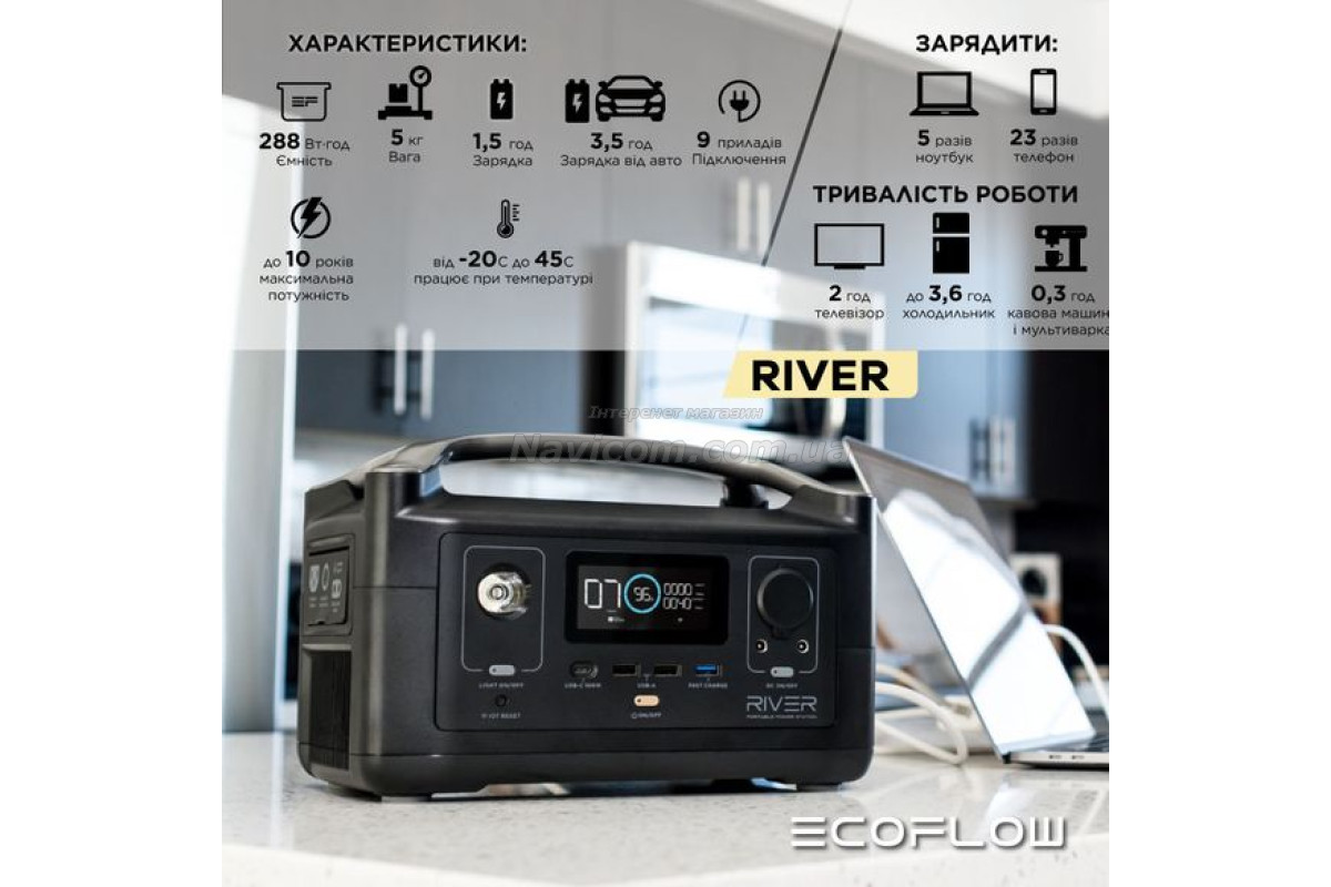 Від електростанції EcoFlow RIVER можна одночасно заряджати до 10 пристроїв. 2 виходи передають немодульований синусоїдальний струм і завдяки режиму X-Boost RIVER може використовуватися для зарядки деяких пристроїв з потужністю до 1800 Вт. Володіючи ємністю 288 Вт·ч, електростанція RIVER може постачати енергією найнеобхідніше обладнання протягом кількох годин, залежно від того, якою є фактична вихідна потужність.