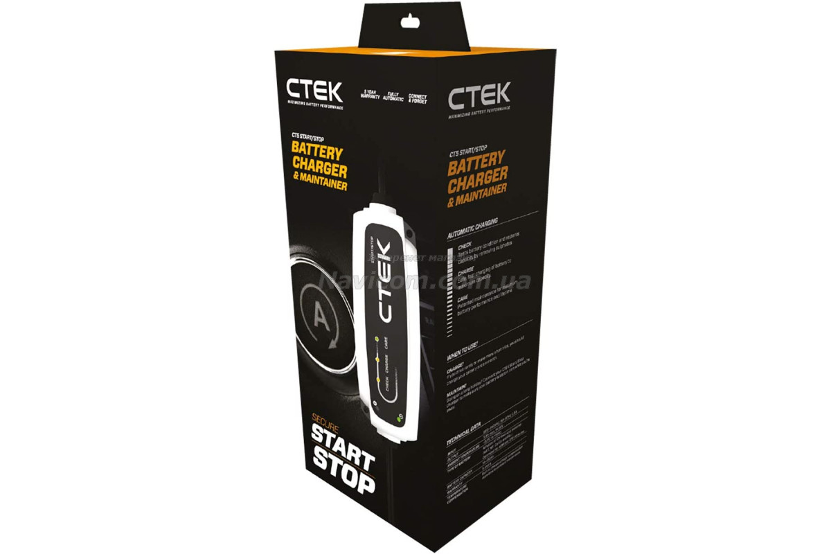 Повністю автоматичний зарядний пристрій CTEK CT5 START/STOP розроблено спеціально компанією CTEK, щоб забезпечити простий і безпечний спосіб зарядки та технічного обслуговування акумуляторних батарей, встановлених на транспортних засобах нового покоління, оснащених технологією "СТАРТ-СТОП". Використання цієї технології дозволяє економити паливо на автомобілі, мотоциклі та іншій техніці, а також знижувати шкідливий вплив на атмосферу.